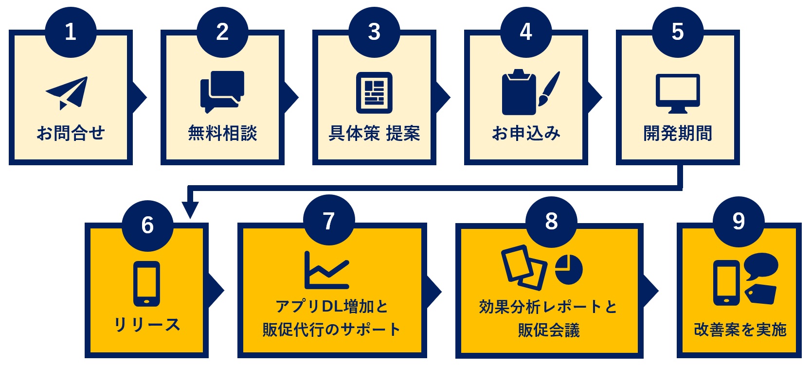 初期費用や月額料金は、導入をご希望の店舗数や実装させる機能、アプリのデザインなどによって異なります。概算のお見積りをいたしますのでお気軽にご依頼ください。
